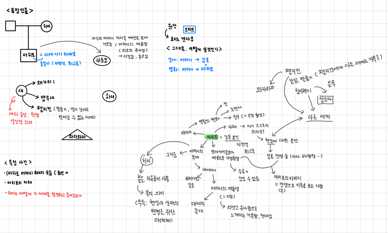 주인공 마히토를 중심축에 두고 몇 가지 뻗어나가며 저의 생각을 덧붙여 보았던 것들입니다